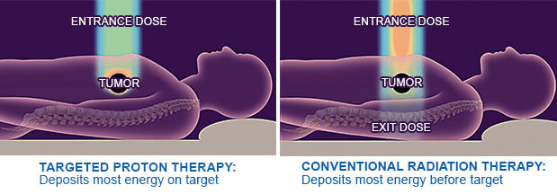 Unlike proton therapy, conventional radiation therapy uses photons which enter the body and deposit most of its energy in normal tissues near the body surface, and then the energy reduces as it goes towards the center of the body. The photons also continue to pass through the tumor and release some radiation to the healthy tissue behind the tumour. This undesirable pattern of energy placement can result in unnecessary damage to healthy tissue, thus increasing the side effects experienced by the patient.