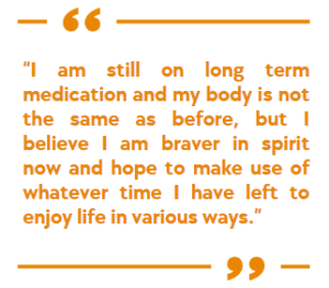 At the end of her treatment, it was a moment of great joy and triumph for Julie as she rang the victory bell at the clinic. The nurses and doctors celebrated with her as she embarked on her new lease of life. With gratitude, she concludes, “I am still on long term medication and my body is not the same as before, but I believe I am braver in spirit now and hope to make use of whatever time I have left to enjoy life in various ways.”