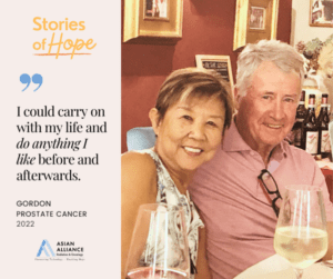 When the results showed that he had stage 2 prostate cancer, Gordon was stunned. All his life, he had been an active person. Ironically, his father and two uncles died at a young age of heart attacks, and so he had always thought that that would be his biggest enemy in life, and that he would have to take special care to avoid contracting a heart attack as he grew older. So, he always looked after his health meticulously. He was fit and active, and closely monitored his blood pressure and cholesterol levels as well.