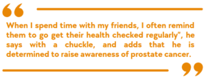 The most important takeaway from this experience, for Gordon, is the importance of annual checkups. He notes that 1 in 8 people might be faced with a diagnosis like his and early prostate cancer is virtually undetectable unless there are regular checkups conducted. “When I spend time with my friends, I often remind them to go get their health checked regularly”, he says with a chuckle, and adds that he is determined to raise awareness of prostate cancer.