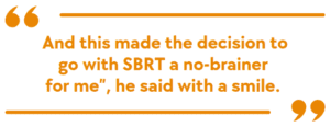 and did not want to endure a longer course of treatment with a conventional schedule of daily radiation sessions for up to 8 weeks. Furthermore, through his discussion with Dr Jonathan, he realised that there was no significant difference between opting for a lower dose for longer periods of time and a higher dose for a shorter period of time in his particular treatment plan, so the SBRT treatment seemed to be optimal. “And this made the decision to go with SBRT a no-brainer for me”, he said with a smile.