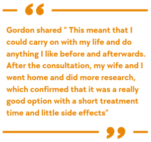 While he had heard of other options for radiation, such as brachytherapy, he decided against it because he did not like the idea of having permanent implants within his prostate. As an active golfer and sportsperson, Gordon was keen to return to his regular schedule of activities,