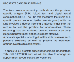 Hydrogel spacer insertion for rectal protection prior to radiation had been introduced relatively recently in Singapore. The concept is simple but elegant – injection of a biodegradable material that creates space between the prostate and rectum to spare the rectum from high dose radiation, which then dissolves away after it is not needed. Medical studies show that long term rectal bleeding risks from radiotherapy are significantly reduced by the procedure. Dr Jonathan offers this routinely to all suitable patients, and because just one needle insertion is required, it can be done under local anesthesia.
