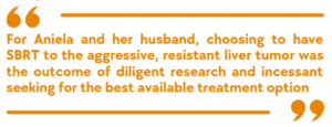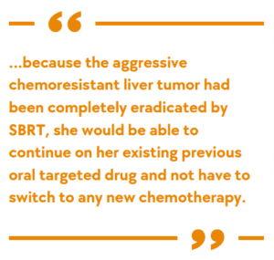 When Aniela and her husband received the news, they were overwhelmed with joy and disbelief. Later on, when their medical oncologist reviewed the scan results, Aniela was told that because the aggressive chemoresistant liver tumor had been completely eradicated by SBRT, she would be able to continue on her existing oral targeted drug and not have to switch to any new chemotherapy. In essence, she would be able to continue life as usual without facing the unknowns of a new treatment regimen.
