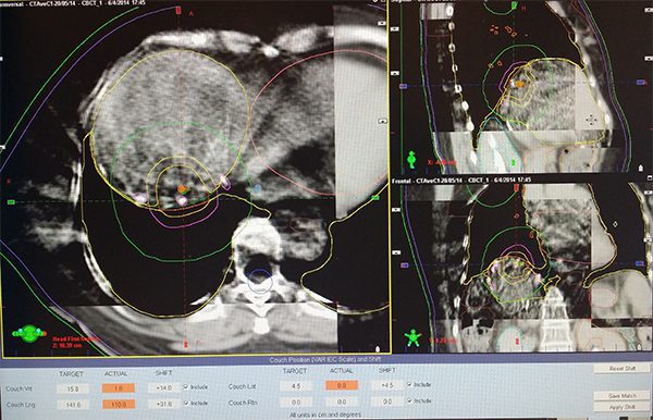 Stereotactic Body Radiation Therapy (SBRT) refers to an advanced form of external beam radiotherapy. A specialised co-ordinate system allows multiple, sharply focussed x-ray beams to hit small targets in the body. This not only allows liver tumors to be treated with great precision (therefore minimizing collateral damage), but also allows the delivery of high doses of radiation to a target within the body in either one or up to five treatment sessions. With such technology, this non-invasive method of delivering radiotherapy is now recognized as one of the options for treating liver tumours. SBRT can be employed to treat both primary and secondary liver tumours, especially those deemed not suitable for surgical removal.